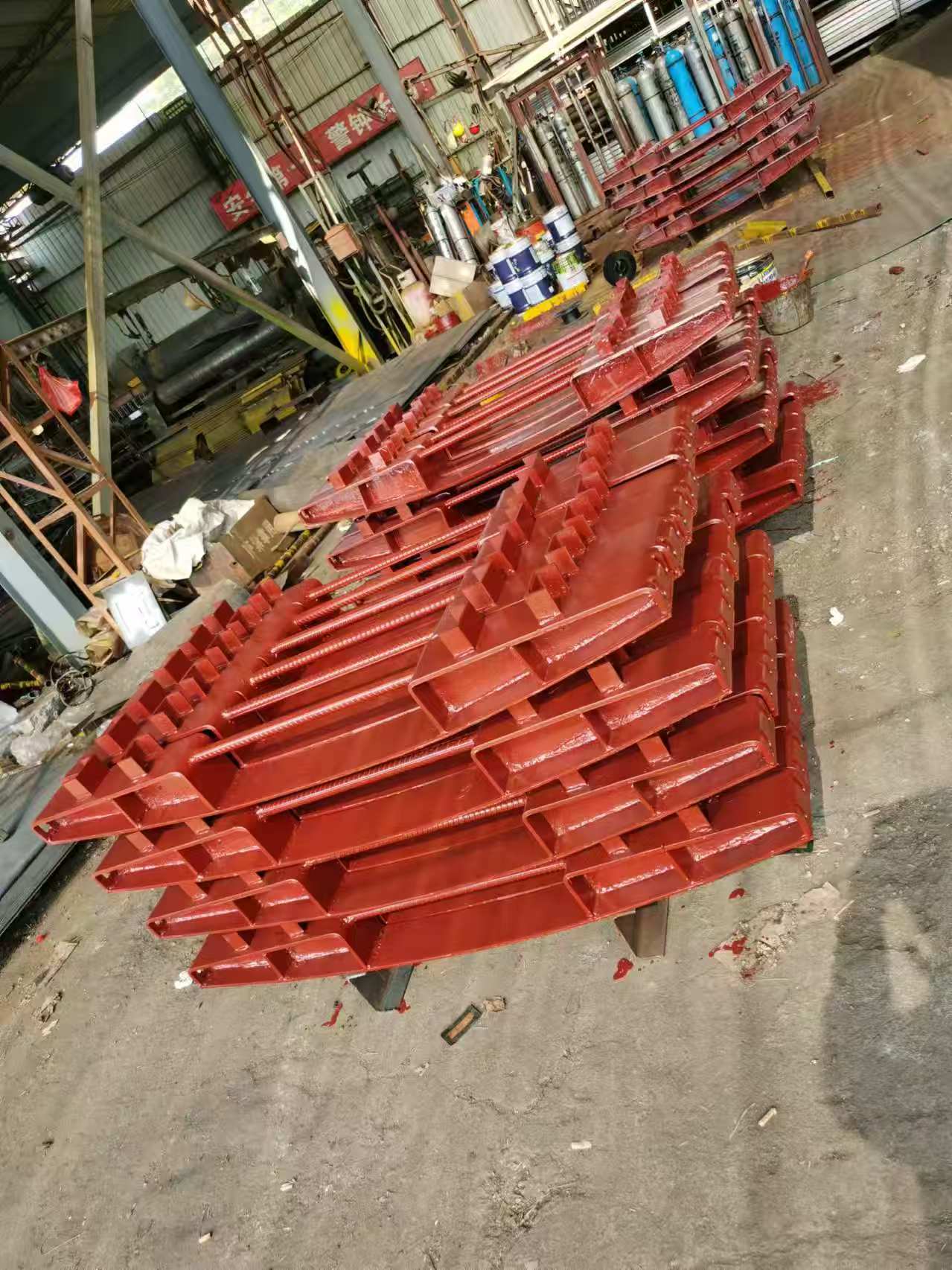 | 材質(zhì)工藝 | - 材質(zhì):Q345B(主流,屈服強(qiáng)度≥345MPa)或 Q235B(輕型荷載); - 成型:熱軋(整體性能優(yōu))或焊接(非標(biāo)定制,如圖中帶錨筋的弧形鋼枕); - 防腐:熱鍍鋅(鍍層≥85μm,鹽霧壽命≥1000h)或環(huán)氧富鋅漆(膜厚≥80μm,干燥環(huán)境)。 |