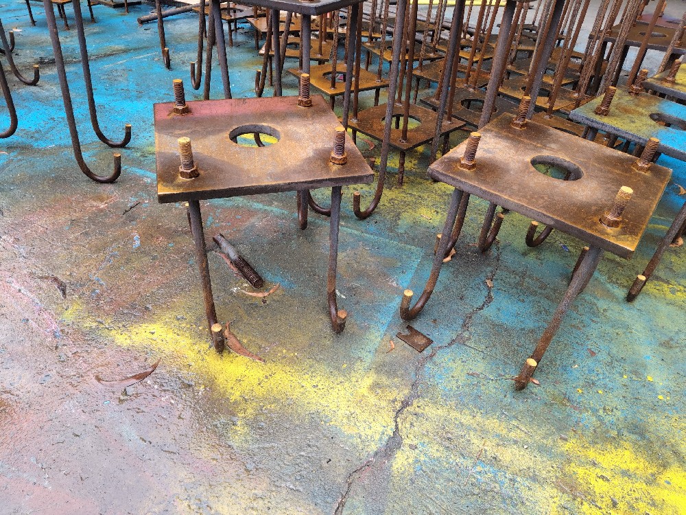 | 錨板參數 | - 材質:Q235B 鋼板(厚度 10~16mm,圖中約 12mm 厚); - 尺寸:方形,常見 300×300mm、400×400mm(圖中約 350×350mm); - 孔位:中心孔(直徑 100~150mm,方便混凝土澆筑排氣)+ 4 個螺栓孔(均布,直徑 22~26mm,適配 M20~M24 螺栓)。 |